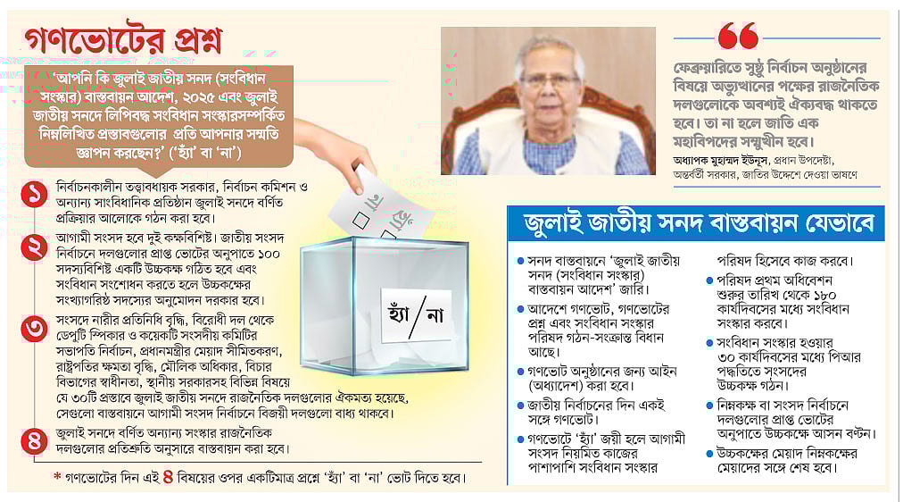 প্রধান উপদেষ্টা জাতির উদ্দেশে ভাষণে বলেন, গণভোটের প্রশ্নটি হবে এ রকম: ‘আপনি কি জুলাই জাতীয় সনদ (সংবিধান সংস্কার) বাস্তবায়ন আদেশ, ২০২৫ এবং জুলাই জাতীয় সনদে লিপিবদ্ধ সংবিধান সংস্কার সম্পর্কিত নিম্নলিখিত প্রস্তাবগুলোর প্রতি আপনার সম্মতি জ্ঞাপন করছেন?’