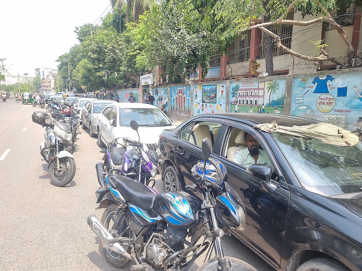 আরামবাগের এইচ কে ফিলিং স্টেশনে তেলের জন্য অপেক্ষা করছেন প্রাইভেট কারের চালক আরিফ হোসেন। আজ শনিবার দুপুরেছবি: প্রথম আলো