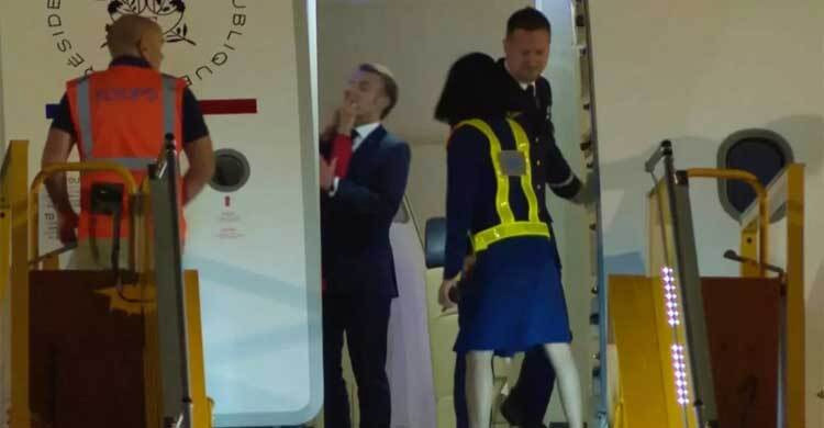 পরে লাল পোশাক পরা ব্রিজিত ম্যাক্রোঁ স্বামীর পাশে প্লেনের সিঁড়ি দিয়ে নামেন, তবে তার বাড়িয়ে দেওয়া হাত ধরেননি।