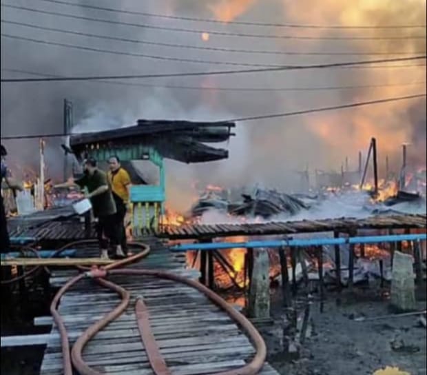 KUDAT: Kira-kira 50 buah rumah setinggan di perkampungan atas air di Kampung Landung Ayang musnah dalam kebakaran yang berlaku petang tadi.