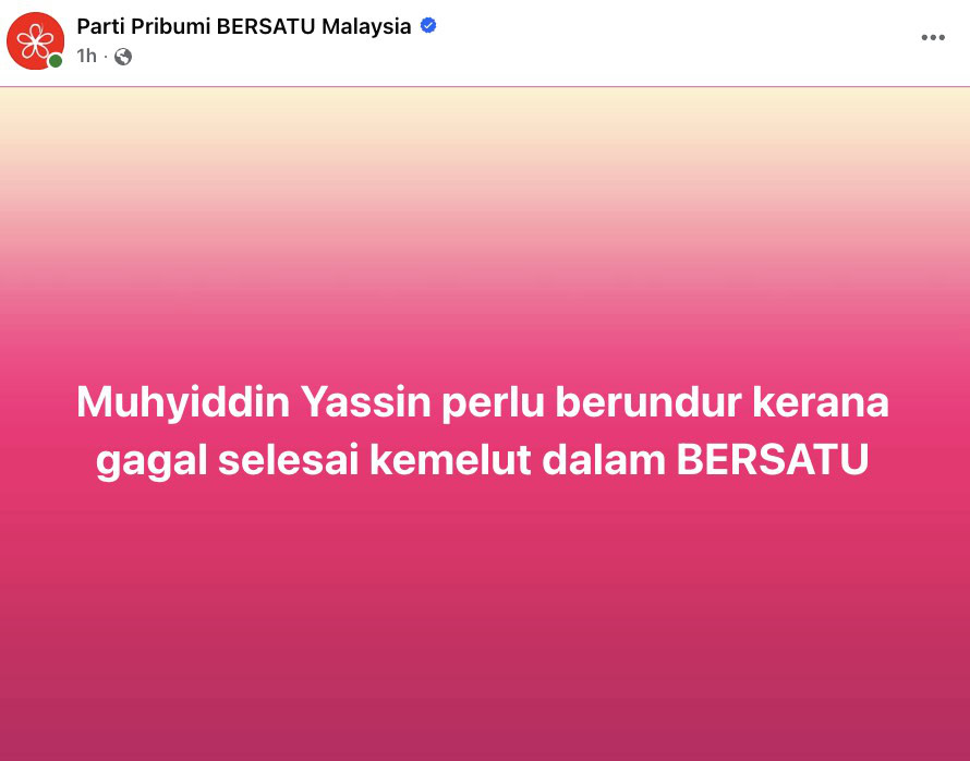 Pengelola akaun Facebook parti BERSATU sendiri telah memuat naik hantaran menggesa Presiden parti, Tan Sri Muhyiddin Yasin untuk berundur susulan beberapa ahli jawatan tertinggi parti tersebut dipecat hari ini.
