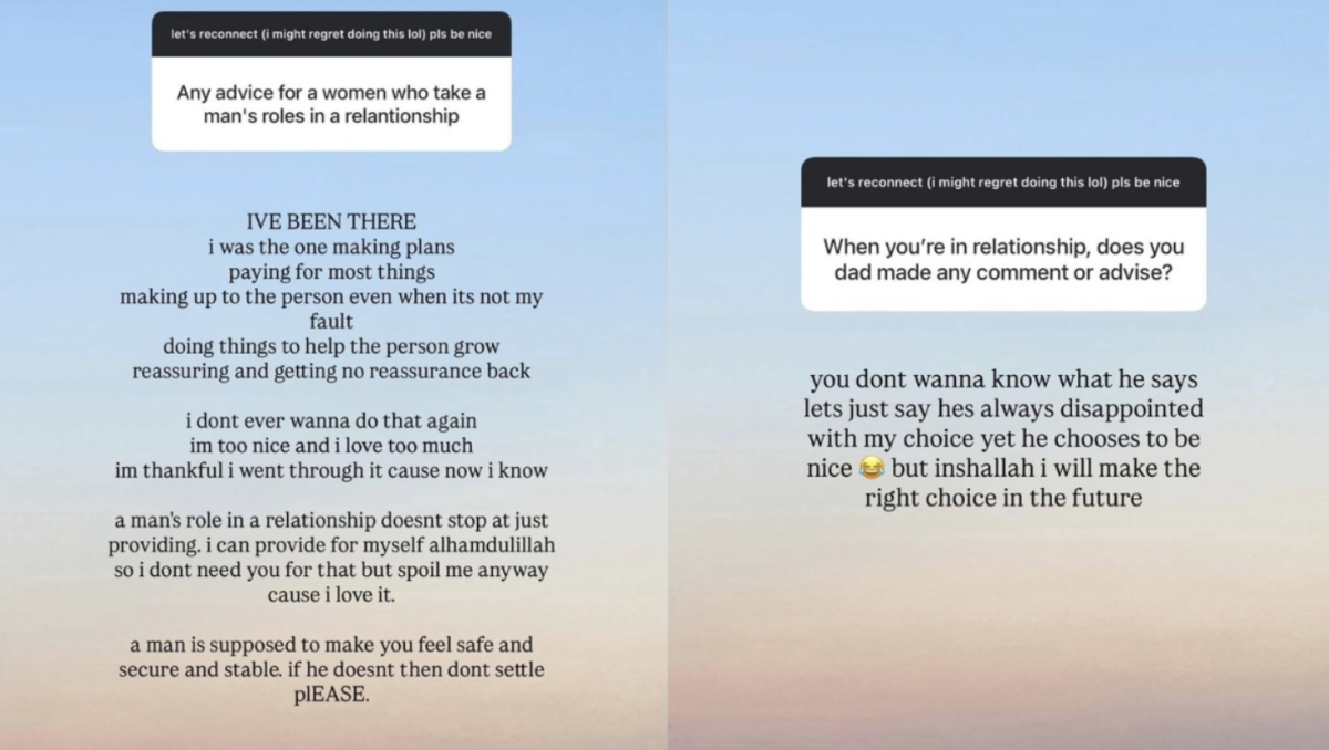 “Peranan seorang lelaki dalam hubungan bukan hanya sekadar menyediakan keperluan, saya boleh menjaga diri sendiri, jadi saya tidak memerlukan kamu untuk itu tetapi manjakan saya juga kerana saya sukakannya.