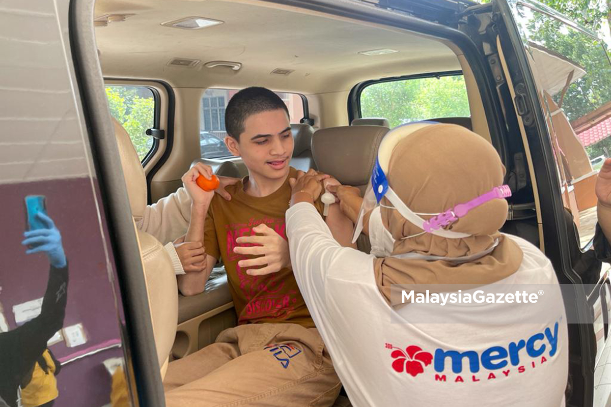 KUANTAN – Seramai 14 anak istimewa dalam kalangan orang kurang upaya (OKU) remaja terdiri 13 hingga 17 tahun menerima vaksin secara pandu lalu daripada Malaysian Medical Relief Society (MERCY) Pahang hari ini.