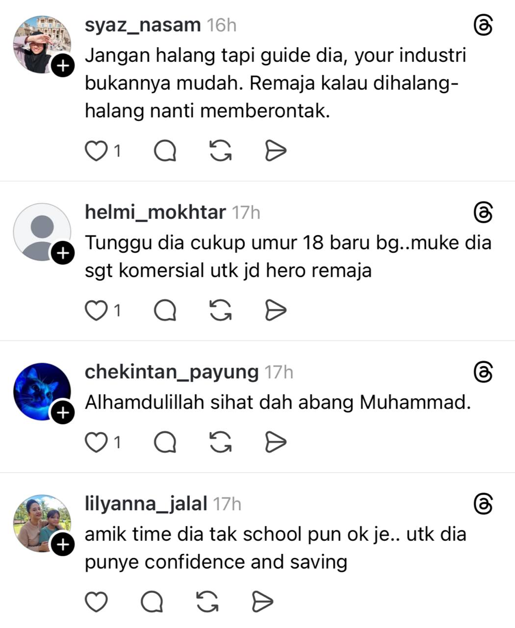 Meninjau ke ruangan komen, warganet memberikan sokongan kepada Muhammad untuk menceburi bidang seni dan memberitahu amatlah sayang sekiranya bakat yang sedia ada tidak diberikan peluang untuk mencuba.