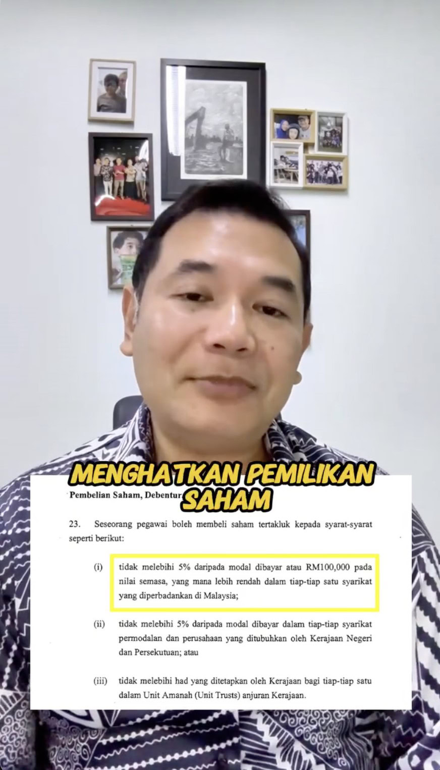 Menurut Pekeliling Tatakelakuan dan Pengurusan Tatatertib Pegawai Awam 2024, penjawat awam tidak dibenarkan membeli saham melebihi lima peratus modal berbayar atau RM100,000 berdasarkan nilai semasa.