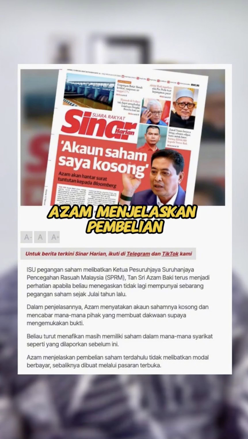 Semalam, Azam menjelaskan beliau telah melupuskan semua pegangan saham sejak tahun lalu, susulan laporan media bahawa beliau memiliki saham dalam Awanbiru Technology Berhad dan Velocity Capital Partner Berhad yang jauh melebihi had ditetapkan ke atas penjawat awam.