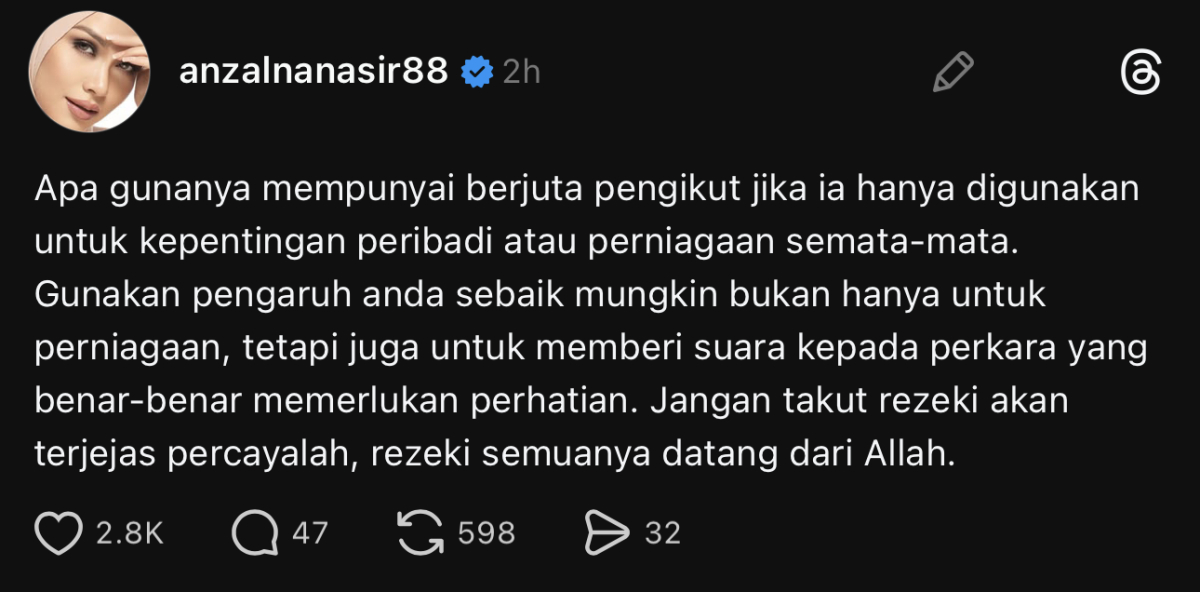 Pelakon dan personaliti popular Anzalna Nasir tampil dengan kenyataan tegas di laman Threads hari ini apabila menegur segelintir pihak yang hanya menggunakan populariti mereka untuk kepentingan sendiri.