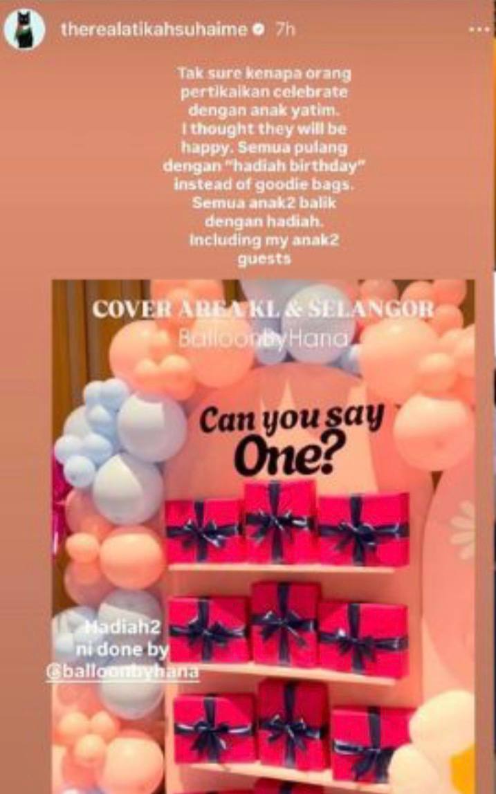 Pelakon Datin Atikah Suhaime tampil memberi penjelasan berikutan ada netizen mempertikaikan tindakannya meraikan sambutan hari lahir anak sulung anaknya bersama anak-anak yatim.