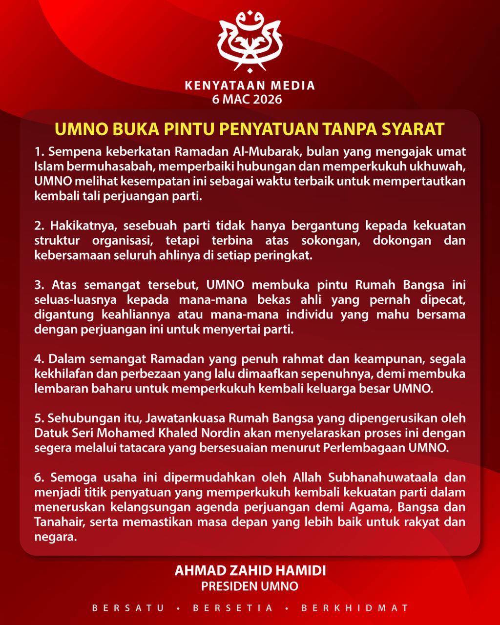 Beliau yang juga Pengerusi Jawatankuasa Penyatuan Rumah Bangsa berkata, seruan Presiden UMNO, Datuk Seri Ahmad Zahid Hamidi untuk membuka ruang kepada bekas ahli kembali wajar disambut dengan sikap terbuka oleh semua pihak.