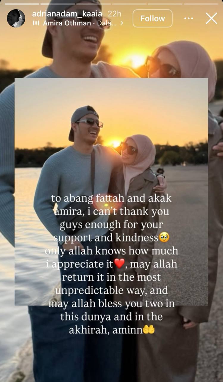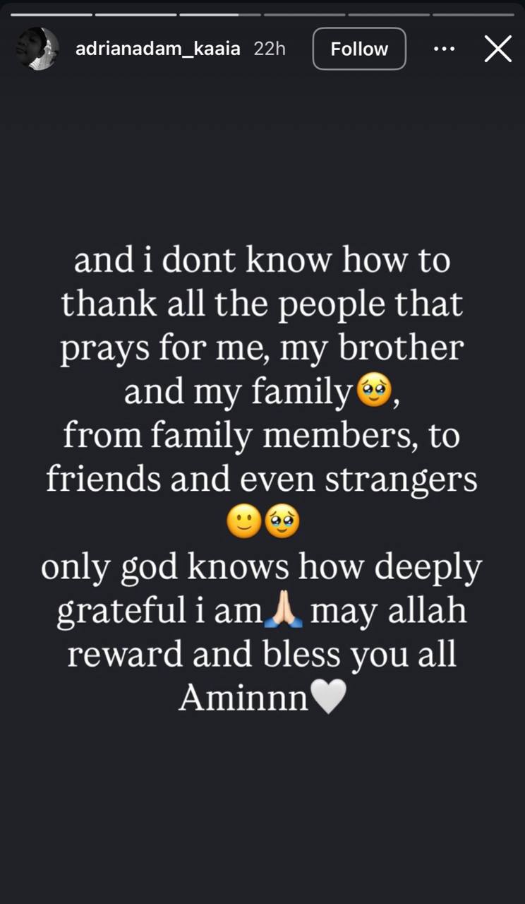 “Hanya Allah saja yang tahu banyak mana saya hargai semua itu. Semoga Allah membalas jasa baik kalian di dunia dan di akhirat,”  kata Adrian menerusi hantaran di InstaStory.