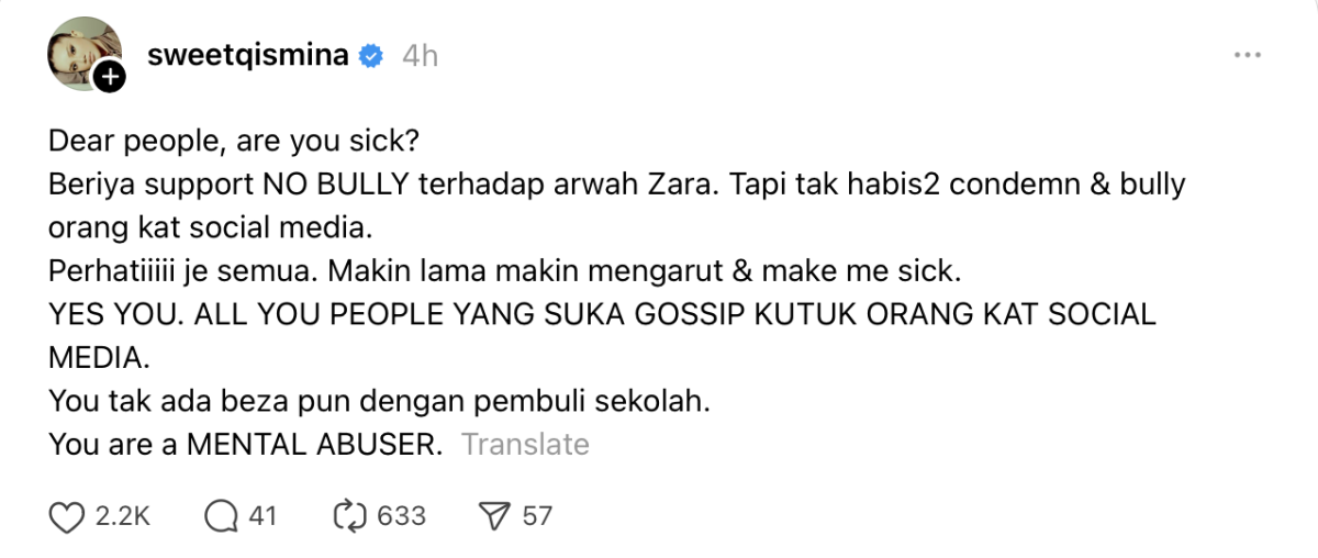 “Wahai manusia, kamu semua sakit ke? Beria sokong no bully untuk arwah Zara. Tapi tak habis-habis kecam & buli orang lain kat media sosial. Perhati je semua, semakin lama semakin mengarut dan buat saya rasa meluat,” tulisnya.