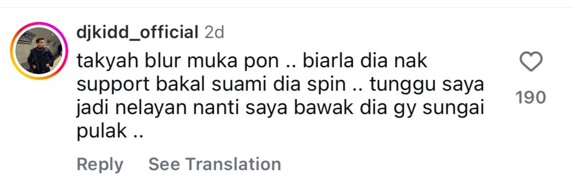 “Tak perlu kaburkan muka pun, biarlah dia nak sokong bakal suami dia ‘spin’. Nanti kalau saya jadi nelayan, saya bawa dia ke sungai pula,” tulisnya.
