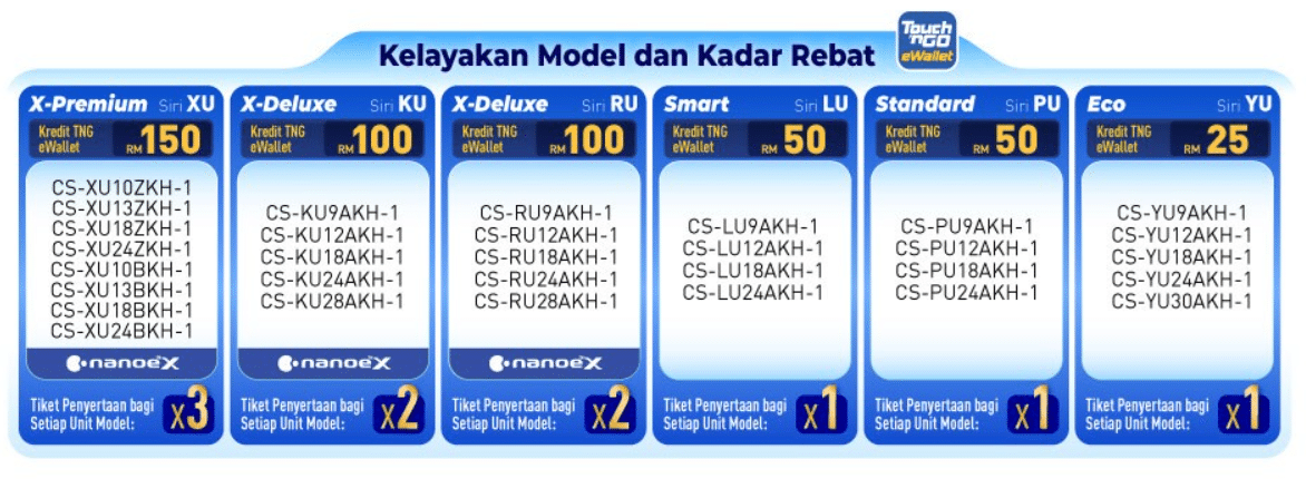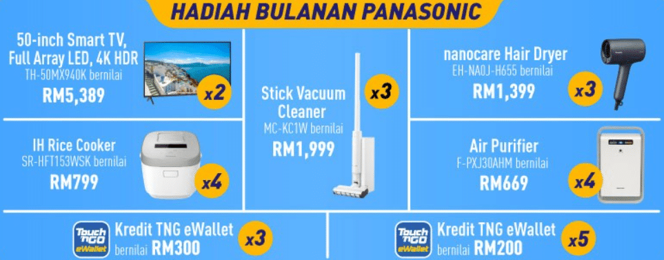 Wow! Banyaknya hadiah menarik! Tapi, bukan itu saja tau, korang juga berpeluang untuk menikmati rebat TNG eWallet dengan pembelian model Panasonic terpilih seperti berikut:
