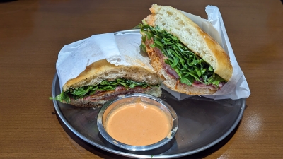 In addition to loaves of focaccia (some feature jalapeno, miso butter, and fried shallots), the signature “sammiches” on the menu caught my eye.