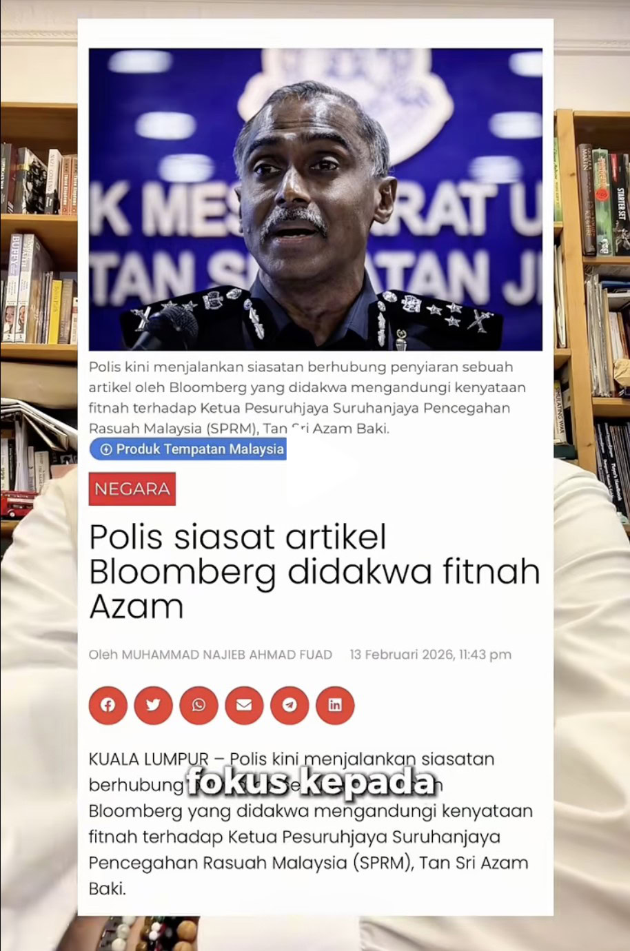 Pengarah Jabatan Siasatan Jenayah (JSJ) Bukit Aman, M Kumar, pada 14 Feb lalu berkata polis membuka kertas siasatan berhubung penyiaran artikel diterbitkan Bloomberg yang didakwa mengandungi kenyataan berunsur fitnah terhadap Azam.