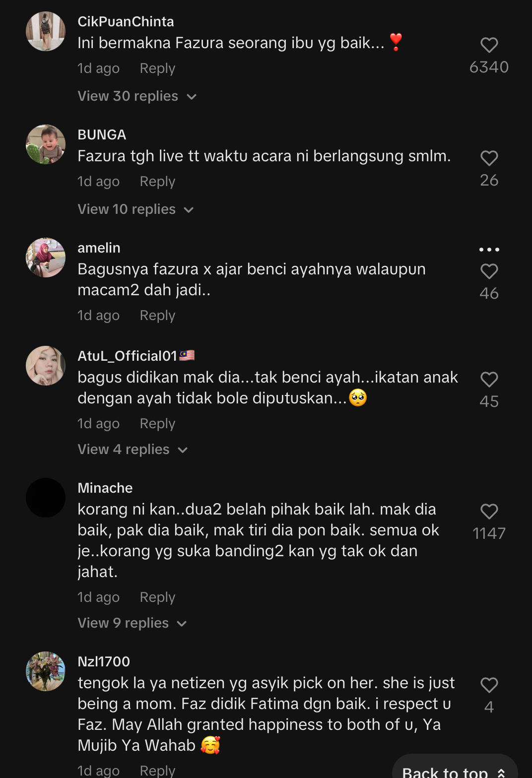Diruangan komen, rata-rata netizen gembira melihat reaksi Fatima. Tidak kurang juga, ramai yang memuji didikan Fazura apabila melihat sokongan Fatima terhadap bapanya.