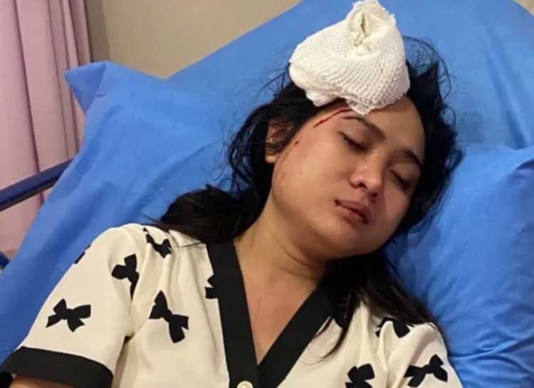 Kelihatan dahi di sebelah kanan Didi berlumuran darah dan sedang terbaring di atas katil.