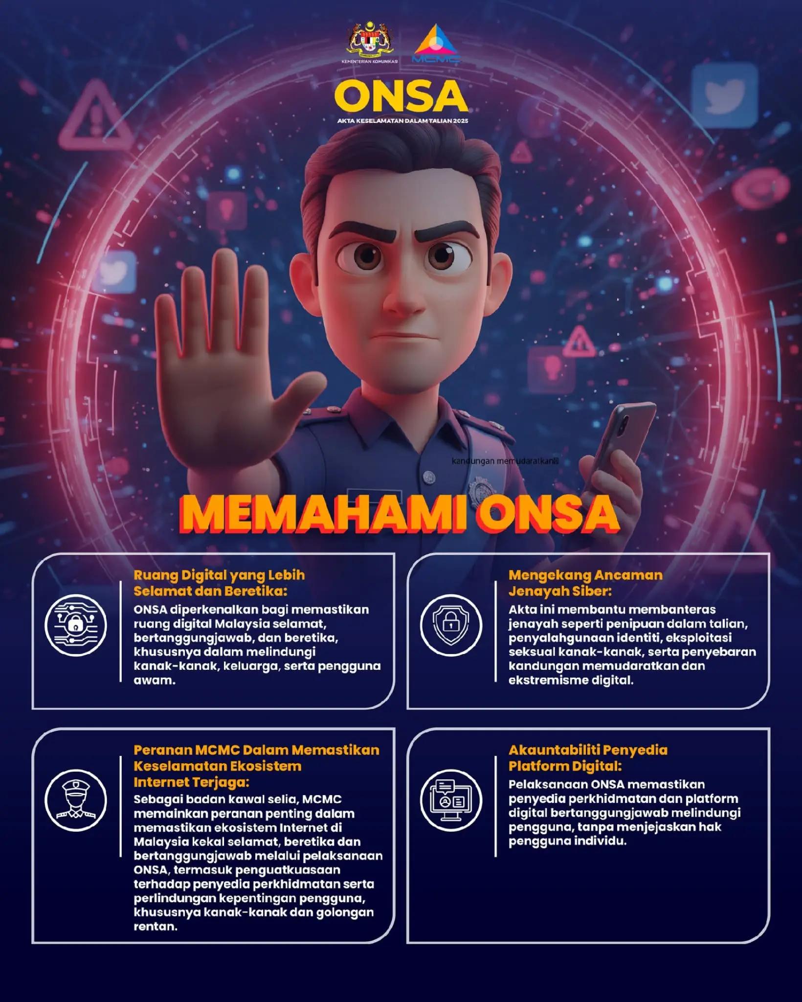 Dalam konteks ini, pelaksanaan Akta Keselamatan Dalam Talian (Online Safety Act – ONSA) dilihat sebagai langkah penting untuk memastikan penyedia platform digital memikul tanggungjawab terhadap keselamatan pengguna, khususnya kanak-kanak dan remaja.