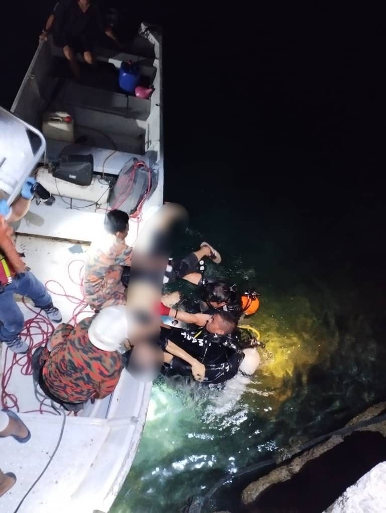 Katanya, sebaik sahaja tiba di lokasi kejadian, didapati sebuah kereta terjunam ke dalam laut dan berdasarkan maklumat pemanggil, dua mangsa terlibat.