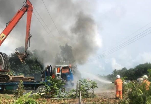 “Pasukan bomba dari Balai Bomba dan Penyelamat Tanjung Manis terus bergerak ke lokasi kejadian dan setibanya di tempat kejadian didapati kebakaran melibatkan sebuah lori yang membawa jengkaut yang tersangkut pada kabel elektrik.