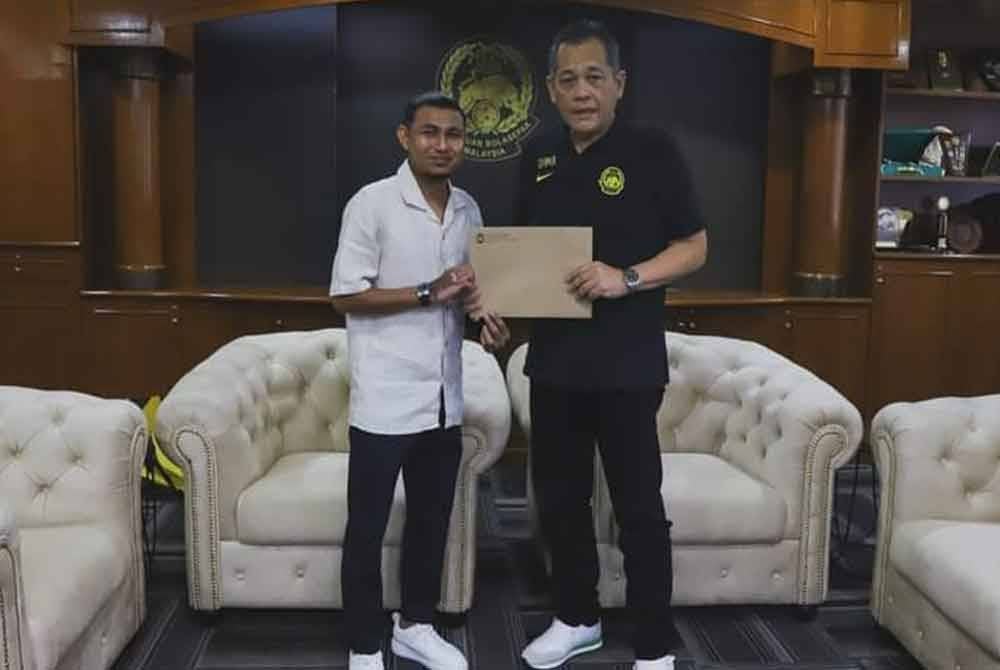 Hamidin (kanan) menyampaikan sumbangan kepada Faisal di Wisma FAM, Kelana Jaya pada Khamis. Foto FB Faisal Halim.