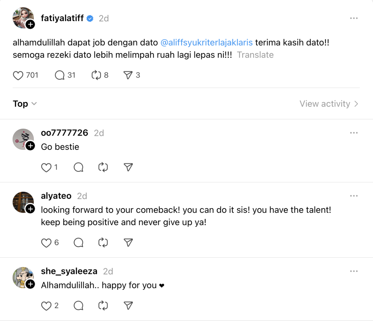Menerusi satu hantaran di Threads, Fathia turut menzahirkan terima kasih kepada Aliff yang menawarkan kerjasama tersebut.