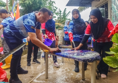 Earlier, Wan Norlee and 50 Kelantan KEMAS staff carried out cleaning work at two nurseries in Kampung Teluk Jering, where floodwaters had risen to over two metres.
