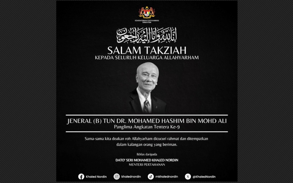 “The remains of General Tun Dr Mohamed Hashim will be placed at Masjid Khalid Al-Walid, Ministry of Defence, for funeral prayers and will be laid to rest after Isyak prayers at Raudatul Sakinah Cemetery, Sungai Besi, with full military honours,” the statement read.