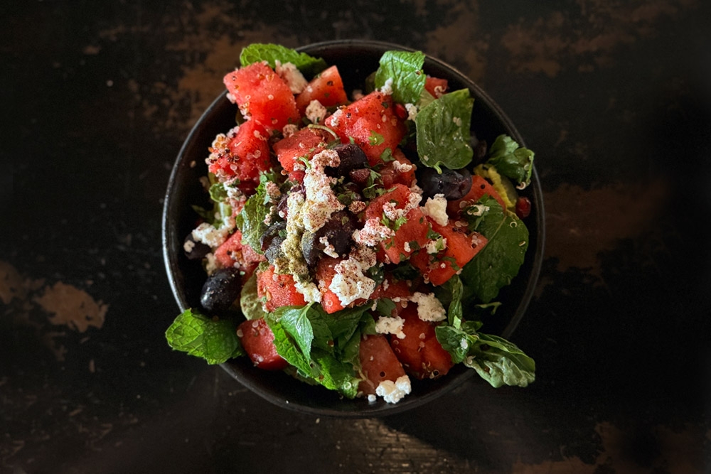 We love how the sharpness of the feta counteracts the sweetness of the watermelon. While its Thai cousin revels in stronger flavours, this Mediterranean interpretation is more measured and its edges softened.