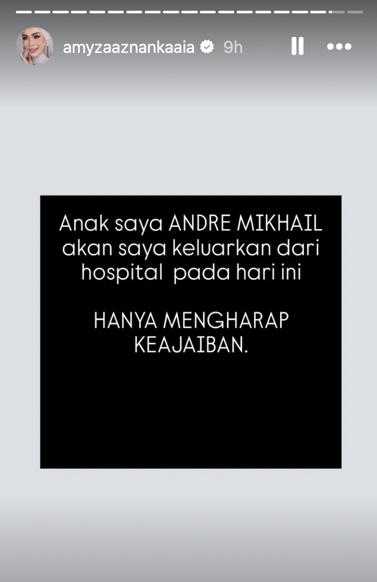 Menerusi perkongsian di Insta Story, Amyza berkata dia menyerahkan soal kesembuhan anaknya, Andre Mikhail kepada keajaiban.