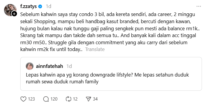 Menerusi satu perkongsian di Threads pula, wanita ini mengaku telah ‘downgrade‘ kehidupan selepas berkahwin dengan Shuk.