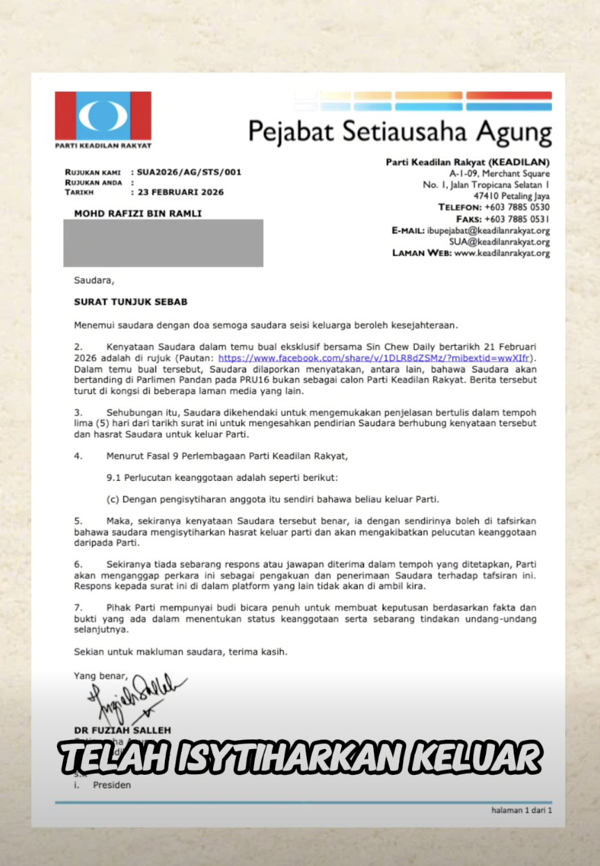 Timbalan Presiden Parti Keadilan Rakyat (PKR), Rafizi Ramli mengesahkan beliau menerima surat tunjuk sebab daripada partinya atas alasan didakwa telah mengisytiharkan keluar parti.