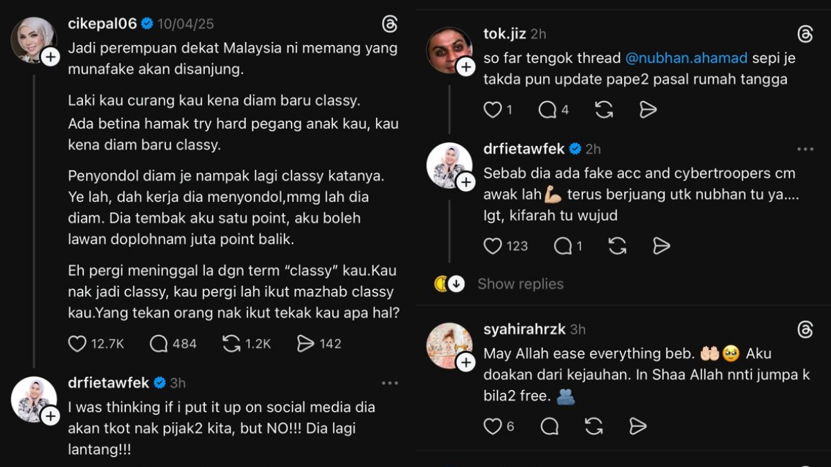 Menerusi satu hantaran di Threads, Dr Fie bagaimanapun mendakwa bekas suaminya dilihat lebih lantang.