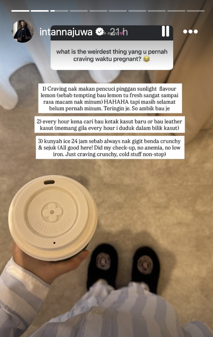 “Kunyah ais 24 jam sebab selalu nak gigit benda rangup dan sejuk. Semuanya selamat, saya buat pemeriksaan, tiada anemia atau tiada kekurangan zat besi. Hanya teringin benda rangup dan sejuk setiap masa,” tulisnya.