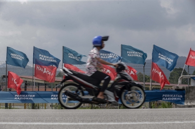 A motorist drives past party flags in Kuala Kubu Baru May 2, 2024. — Picture by Sayuti Zainudin