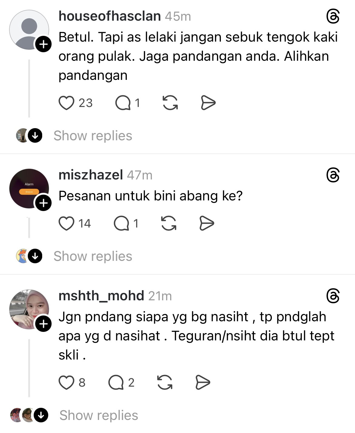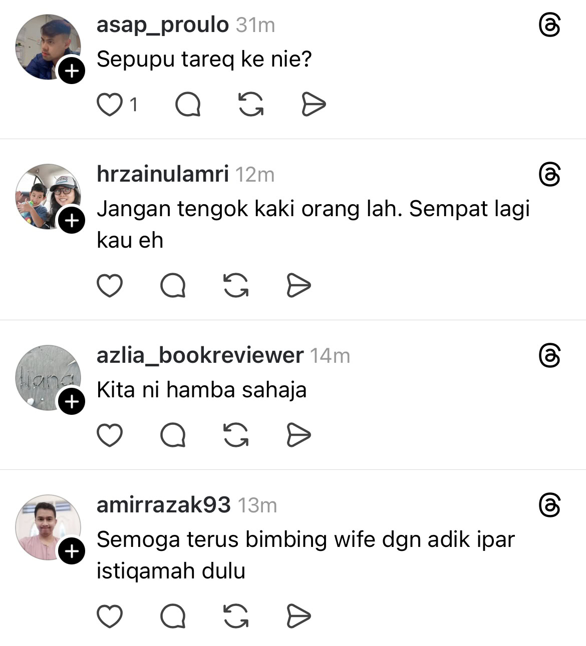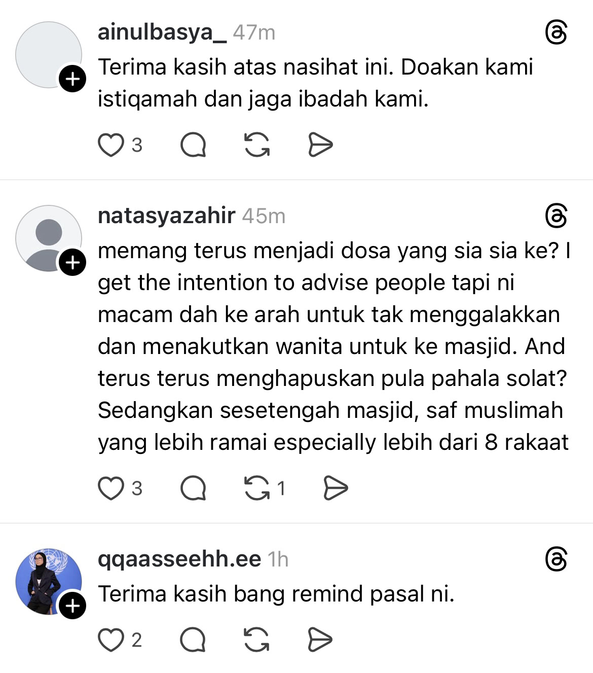 “Banyak wanita Islam di Malaysia yang pergi ke masjid pada bulan Ramadan ni untuk iftar dan tarawih, tapi tak pakai stoking. Kaki perempuan tu aurat, takkan tak tahu?” ciapannya, hari ini.
