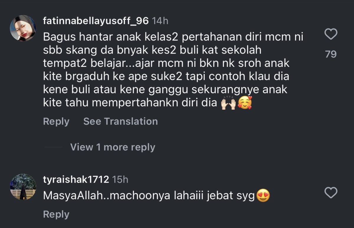 Diruangan komen, rata-rata netizen ianya langkah yang bagus menghantar anak mengikuti kelas mempertahankan diri serta memuji kecomelan Jebat.
