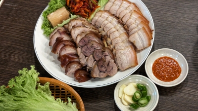 Often served in large portions to be shared, it’s typically eaten as a ssam — wrapped in lettuce with sauce and vegetables — much like the more popular bossam (thinly sliced boiled pork belly or shoulder).