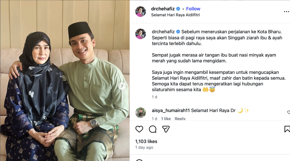 Menerusi perkongsian di Instagram, Dr Hafiz dilihat memuat naik gambar bersama ibunya di hari raya namun tidak kelihatan kelibat Julia.