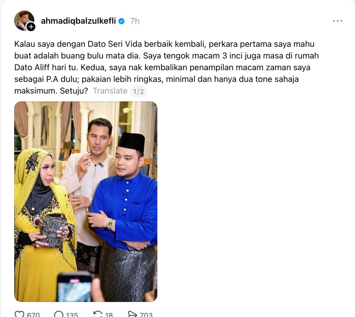 Menerusi satu hantaran di Threads, Iqbal turut berseloroh mengatakan dia melihat bulu mata Vida sepanjang 3 inci ketika menghadiri rumah terbuka Datuk Seri Aliff Syukri baru-baru ini,