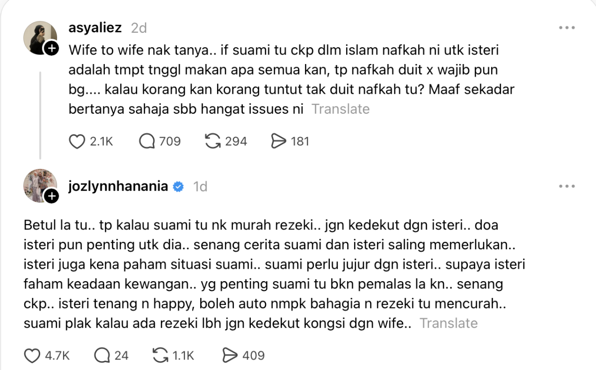 Menerusi satu hantaran di Threads, seorang individu bertanyakan mengenai nafkah seorang suami terhadap isteri.