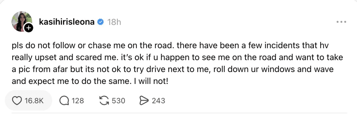 Leona meluahkan rasa tidak selesa dengan tindakan tersebut menerusi Threads. Katanya, perkara ini sudah berlaku beberapa kali dan benar-benar menakutkan dirinya ketika memandu.