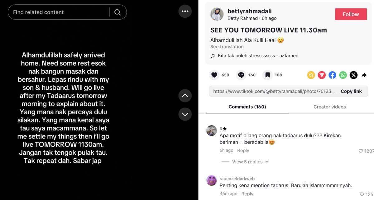 Dalam pada itu, Betty dilihat ada memuat naik kenyataan akan menjelaskan mengenai isu berkenaan secara siaran langsung pada jam 11.30 pagi.