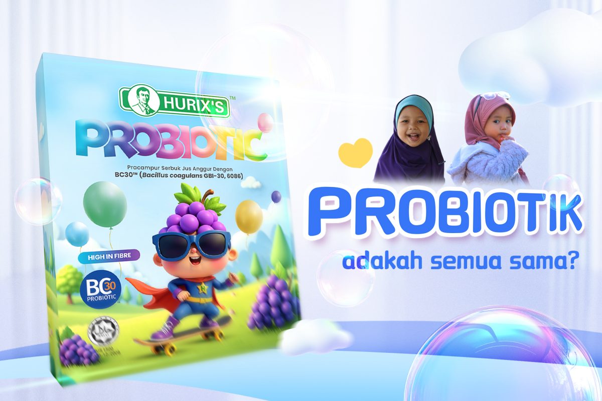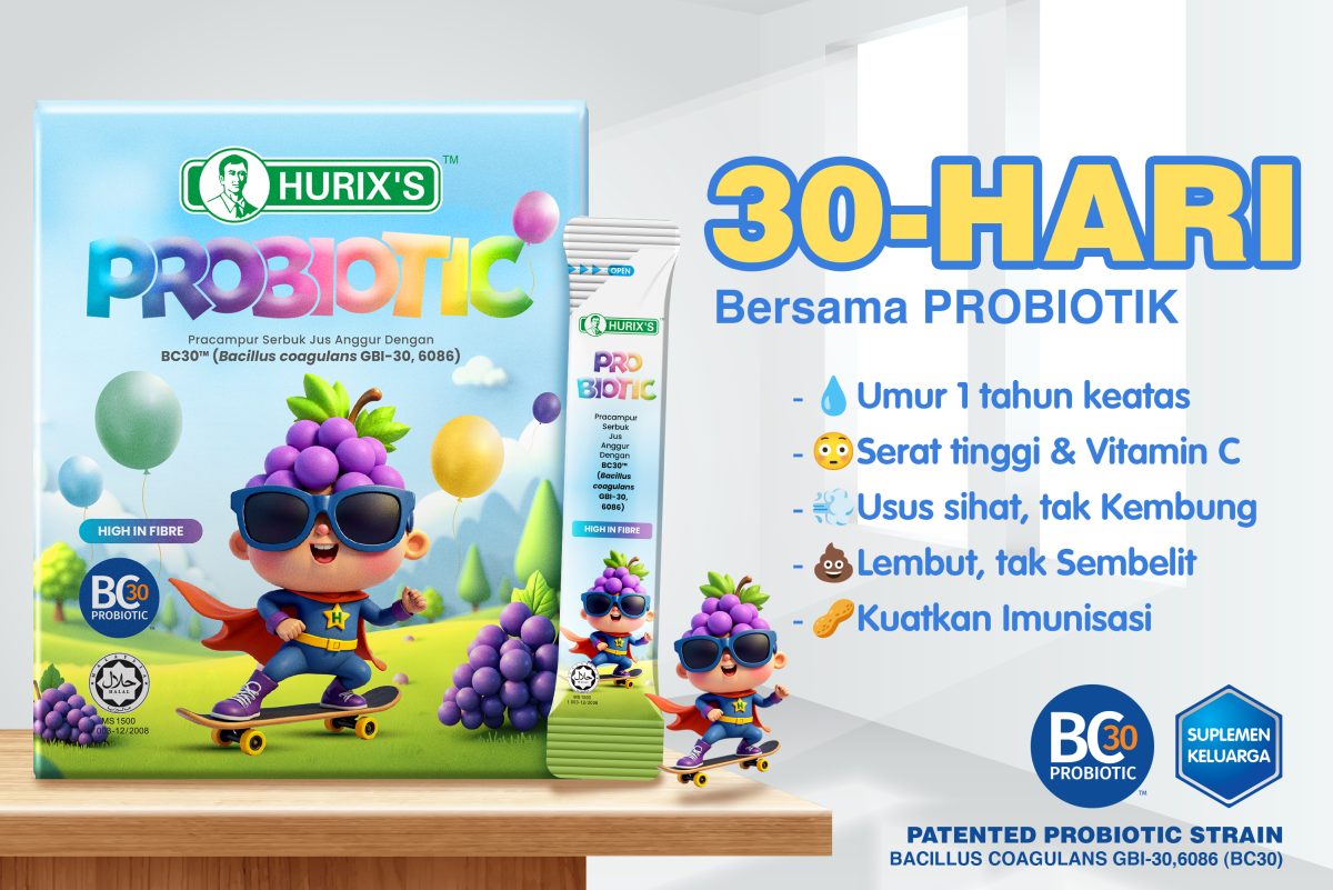 HURIX’S Probiotic, misalnya menggunakan BC30® iaitu strain probiotik berdaftar dan telah dikaji secara klinikal. Strain ini direka untuk lebih stabil serta tahan asid perut dan haba, sekali gus membantu lebih banyak bakteria baik sampai ke usus.