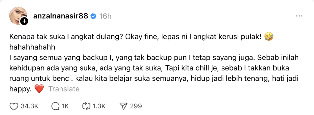 Dalam hantaran berkenaan Anzalna turut meluahkan rasa sayang kepada mereka yang menyokongnya dan baginya lumrah dalam kehidupan ada yang suka dan ada yang tidak suka.