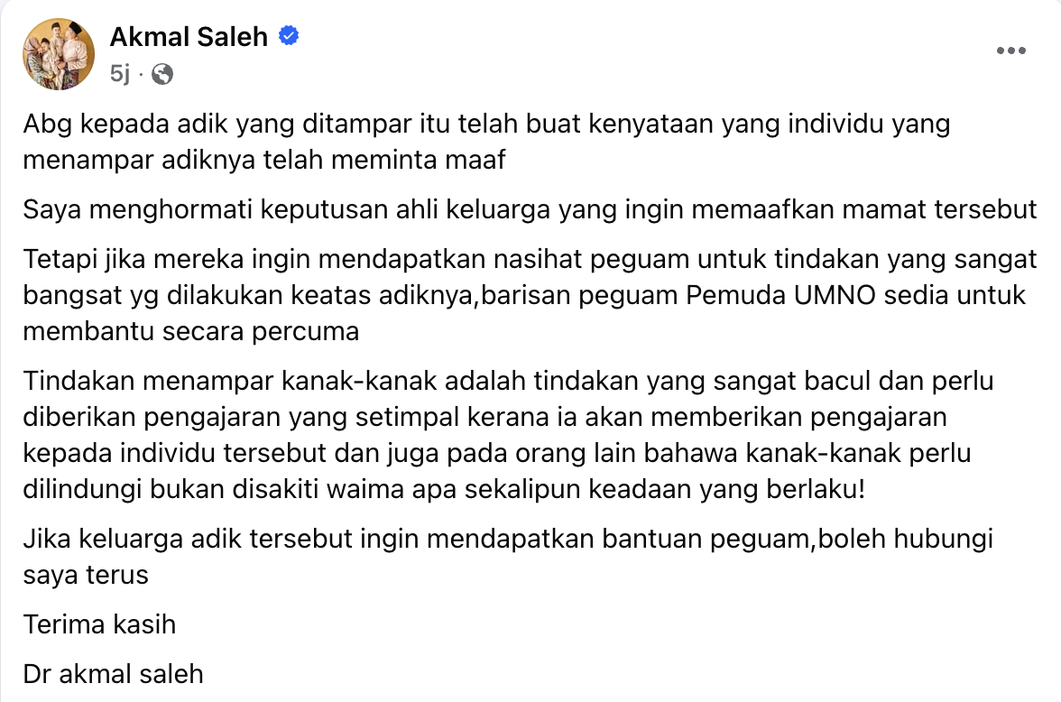 “Abang kepada adik yang ditampar itu telah membuat kenyataan bahawa individu tersebut sudah meminta maaf. Saya menghormati keputusan ahli keluarga yang ingin memaafkan mamat tersebut,” kata Akmal, hari ini.