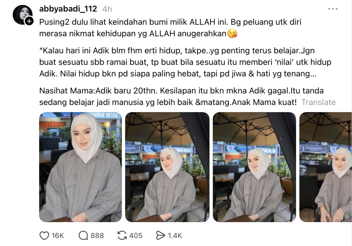 “Nasihat Mama, Adik baru 20thn. Kesilapan itu bukaan makna Adik gagal. Itu tanda sedang belajar jadi manusia yang lebih baik dan matang. Anak Mama kuat,” tulisnya.