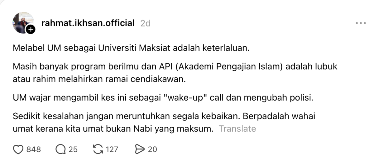 Menerusi perkongsian di Threads, PU Rahmat berkata pusat pengajian berkenaan masih mempunyai banyak program berilmu yang melahirkan golongan cendekiawan termasuk dari Akademi Pengajian Islam (API).