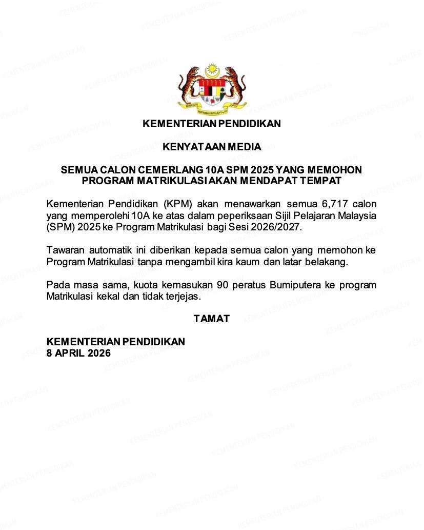 Kementerian Pendidikan (KPM) mengumumkan bahawa semua 6,717 calon yang memperoleh keputusan cemerlang 10A ke atas dalam peperiksaan Sijil Pelajaran Malaysia (SPM) 2025 akan ditawarkan tempat secara automatik ke Program Matrikulasi bagi sesi 2026/2027.