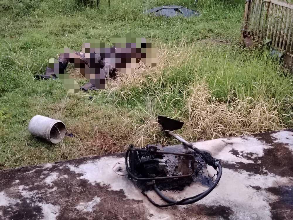 Mangsa disyaki rentung akibat mesin rumput yang dipercayai terbakar dan menyambar badan lelaki berkenaan.